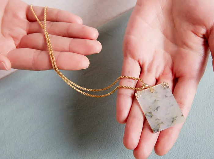 每一块翡翠,都会做成如图的祥云边框镶嵌款吊坠,18K金材质,非常精致。