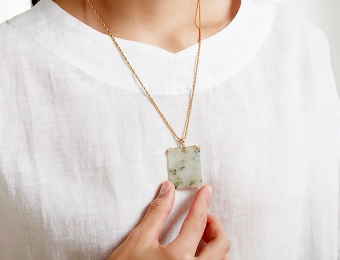 较轻薄的方块吊坠,搭配细细的链子,很有轻盈感,男女都适合。