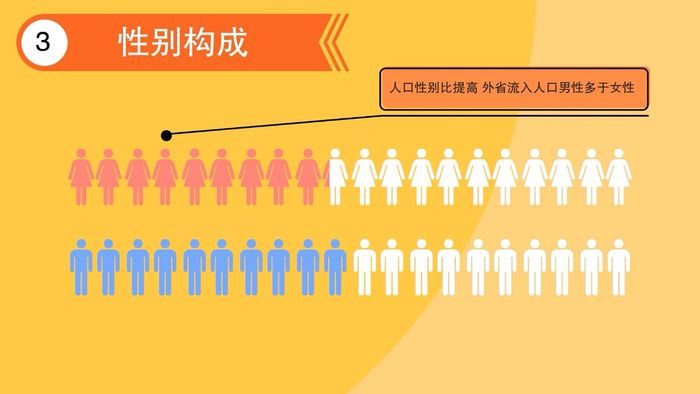 广东人口性别比提高主要受外省流入人口性别比偏高影响。从户籍人口看,2020 年广东户籍人口性别比为104.97, 比2010年下降约1.2个百分点,性别比趋于均衡状态;而外省流入人口性别比则从2010年的125.49大幅提高到2020年 的144.60,全省近一半市外省流入人口性别比超过145, 且外省流入人口占全省常住人口比重继续上升,比2010年提高2.90个百分点。外省流入人口的性别比高低与产业结构变化不无关系,广东作为全国制造业大省,产业结构重型化特征明显,对男性劳动力需求量增加。
