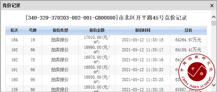 该地块为本次集中出让热门地块,共吸引了万科、保利、龙湖、华润、中海、绿城、中巍、碧桂园、金地、招商、金科、中南、海信、青城、旭辉银盛泰、青特、平安17家房企参与竞价,经过164轮竞拍叫价升到楼面价17010元/㎡,超过最高限价发生熔断,网上土地竞价中止,转入网下5月14日进行竞自持面积,最终绿城以2156.9㎡的自持建面竞得,成交总价6.4亿元,楼面价17000元/㎡,成为市北区新的地价之王。