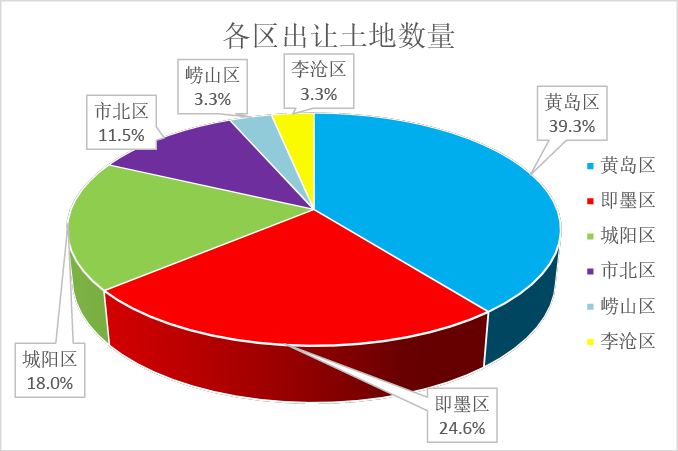 区域分布方面,本次出让地块分布情况与上一年度的土拍热度情形大致吻合。黄岛区、即墨区、城阳区出让排名前三,黄岛区供地最多,本次出让占比39.3%,其次是即墨区占比24.6%,城阳区占比18.0%。市北区本次出让占比11.5%,其中开平路45号地块最为抢眼,而崂山区、李沧区本身开发程度较高、地价也在高位,本次出让数量较少。