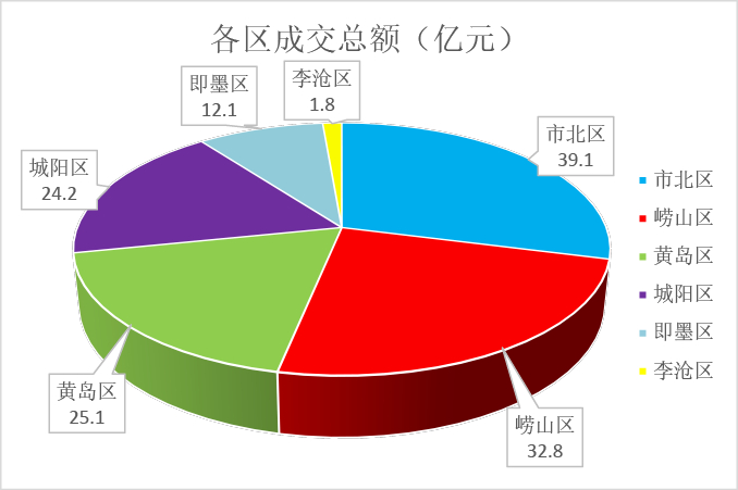总体来看成交总额高的区域集中在高价区,土地稀缺但拿地价高,市南区本次无地块出让,市北、崂山区价格较高,供地数量相对较少但总价仍居高位。黄岛、即墨和城阳区相对价格低,区域面积大,规划地块较多而已开发程度相比市南、市北和崂山区要低一些,供应量相对较大。