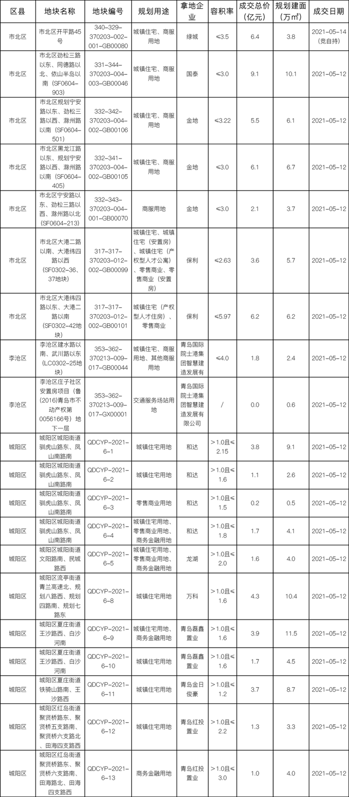 5月12-14日,青岛市首次进行住宅用地集中出让活动,在低迷了两个月的土拍市场掀起了热潮。连续三天的土拍囊括了市北区、李沧区、城阳区(第一天22宗),崂山区、即墨区(第二天17宗),黄岛区(第三天24宗)六个区共63宗住宅、商业地块,最终线上成交60宗,达最高限价熔断1宗(线下竞自持),流拍2宗。本次出让地块总计建设用地面积152万㎡,出让规划建面321万㎡,成交规划建面318万㎡,三天共揽金达135亿元。