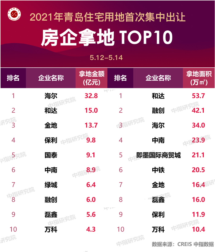 本次集中供地共有二十多家房企实现拿地,其中除鲁商与华润等个别企业外,绝大多数均为独立拿地。其中海尔产城创收入崂山区2宗改造项目地块,总金额达到32.8亿元,面积34.0万㎡,分别位居拿地金额榜、面积榜第一、第三名;和达总拿地金额15.0亿元,面积53.7万㎡,位列金额榜第二名、面积榜第一名;此外金地以13.7亿元的拿地金额在本次金额榜中排名第三,而融创在藏马山区域多地块拿地共42.1万㎡在面积榜中排名第二。其它如保利、中南、万科等全国知名房企也在本次集中出让中拿地并排名进入TOP10之列.
