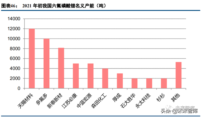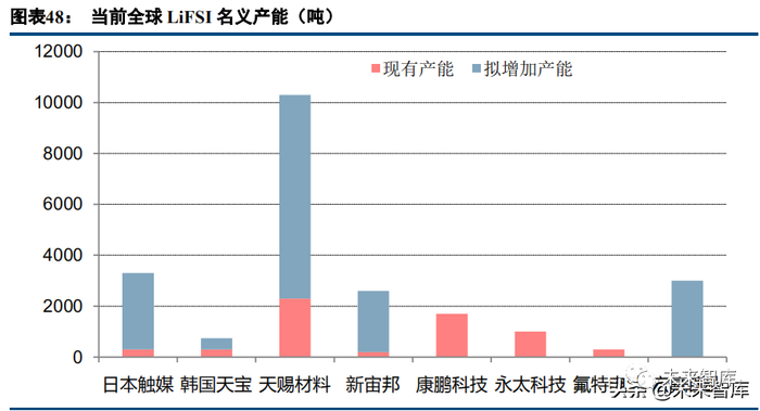 全球 LiFSI 现有名义产能超过 6000 吨。天赐材料、康鹏科技、永泰科技位居前 3。至 2025 年,如假设全球 锂电池有 600GWh 添加 LiFSI,平均添加量 5%,则规模或达 3 万吨;届时如果按 30 万元/吨中性价格估算,全 球市场空间约 90 亿元。远期,如果锂金属负极电池爆发,LiFSI 还有可能从锂盐添加剂成为主盐。