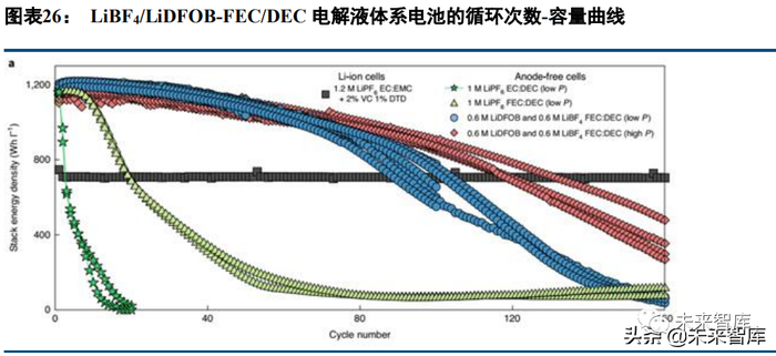 LiFSI 的积极作用还为多个研究团队所证实。如斯坦福大学 Y. Cui 团队和 ZN. Bao 团队合作的研究成果 Molecular design for electrolyte solvents enabling energy-dense and long-cycling lithium metal batteries 2020 年发 表于 Nature Energy 上。研究工作设计了单一溶剂氟化 1,4-二甲氧基丁烷 FDMB,和 LiFSI 搭配制得电解液;再 采用 NCM532 为正极,不同厚度锂金属为负极,制作了相应软包电池;还采用 NCM523、622、811 正极,分别 制作了无负极软包电池。在此基础上,测试了不同条件下的电池性能(包括截止电压 4.4V 的高度充电状态)并 分析了相关机理。