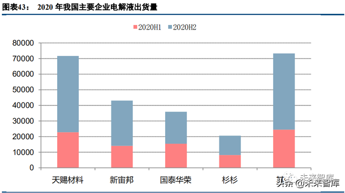行业集中度方面,CR4 约 70%;下半年需求爆发时,天赐材料、新宙邦的市场占有率提升。多个电解液企 业在不同程度扩大产能。