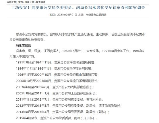 (图说:鹰潭市纪委监委网站对冯永忠主动投案的通报)