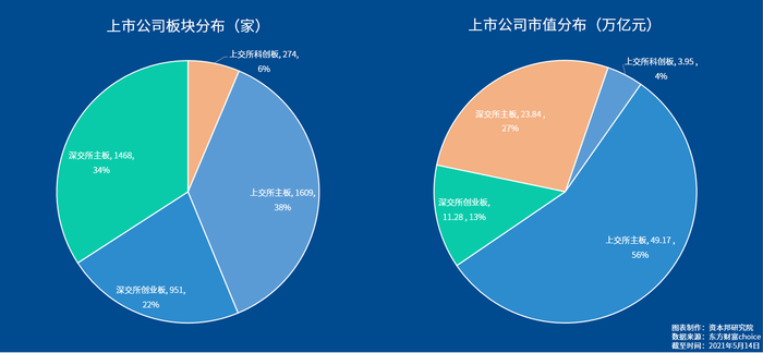 其中,上交所主板共有1609家上市公司,占总上市公司数量的比重最大,为38%;从市值上来看,上交所主板的所有上市公司总市值达到了49.17万亿,占A股上市公司总市值超过50%,达到了56%。