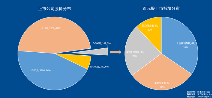 从具体的股价来看,截至5月14日收盘,共有142家企业股价大于100元,其中两家大于1000元,分别是贵州茅台的2009.85元和石头科技(688169.SH)的1261.99元。