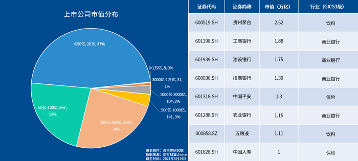 总市值小于50亿的上市企业为2019家,占A股上市公司总数量的47%,市值50-100亿的为967家,占比23%;总市值在100-500亿的上市公司共有1032家,占比为24%。