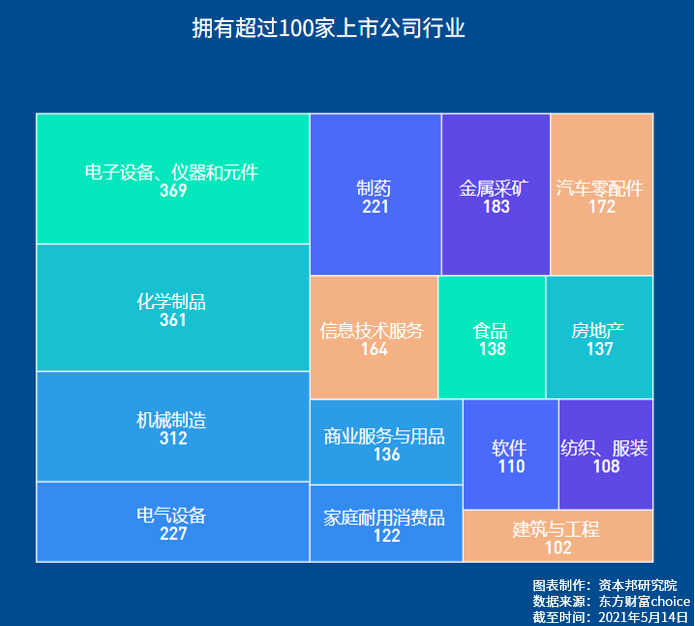 从行业来看,根据GICS三级行业分类,A股电子设备、仪器和原件行业共有169家上市企业,其次是化学制品行业,共有361家上市企业,排名第三的是机械制造,为312家。拥有超过100家上市企业的行业共有15个。
