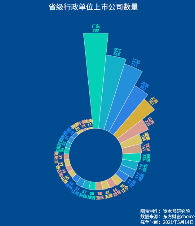 以省级行政单位来看,广东拥有最多的上市公司,达到709家,其次是浙江,为548家,排名第三的是江苏,有511家上市企业。拥有上市企业最少的是青海,只有11家,宁夏则为15家,西藏为20家。