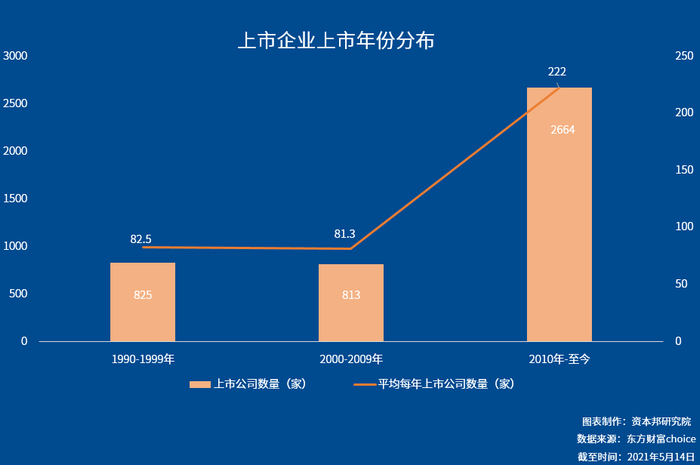 从时间上来看,资本市场成立前十年(1990-1999年),总共有825家企业上市,平均每年为82.5家,进入千禧年的前十年(2000-2009年),环比前十年略微下降,共有813家企业在A股上市,平均每年为81.3家。而进入新千年第二个十年开始,A股上市企业开始大增,从2010年至2021年5月14日,共有2644家企业在A股上市,平均每年为222家。这也是随着中国经济快速发展的必然结果,大量优质企业的出现对融资的需求也在大增。