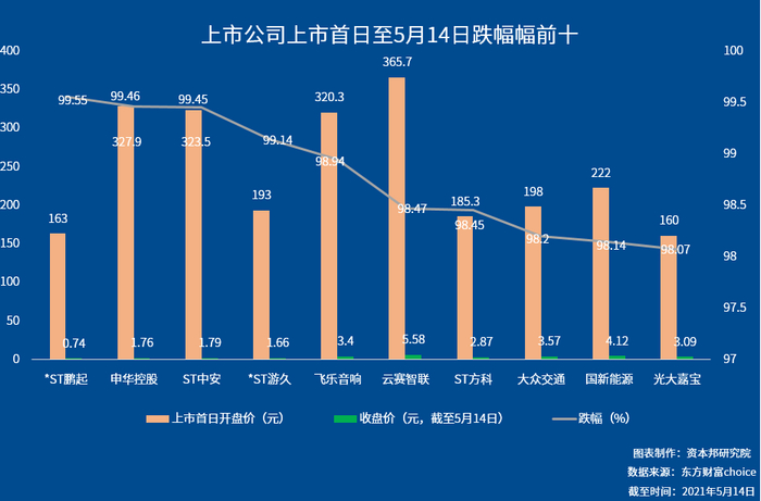 大涨之外,也有上市公司上市之日至5月14日大跌,根据东方财富choice的数据显示,跌幅超过50%达到了1724家,占A股上市公司数量的40%。跌幅超过90%的企业有166家。