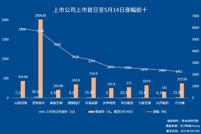 从股价的表现来看,有23家企业的涨幅超过10倍,其中山西汾酒的涨幅最大,从上市首日开盘价的7.21元到截至5月14日收盘价的434.66元,涨幅达到了5929%;其次是贵州茅台,从34.51元到2009.85元,涨幅达到了5724%。