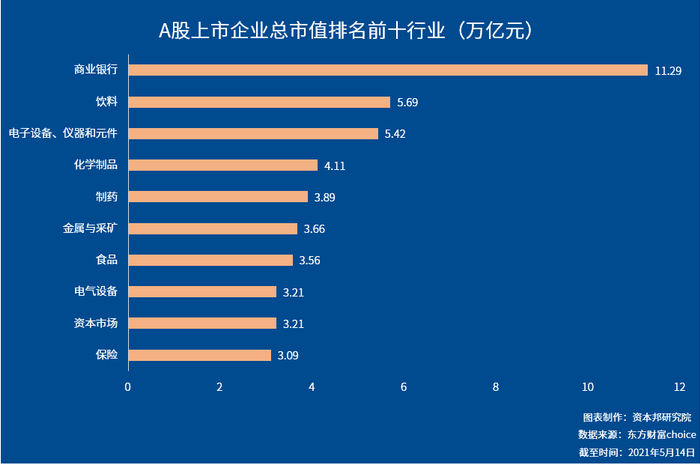银行、白酒行业总市值名列前茅