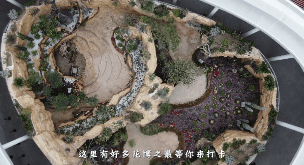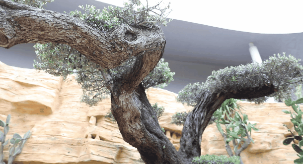 展厅以砂岩山谷为地貌框架,分为沙谷与绿洲两大空间,中间为岩洞连接。穿过岩洞,展现小型多肉植物,主要结合垂直多肉墙,人文雕塑,壁画等。绿洲景观区以油橄榄为中心,周边模拟植物根系盘绕延伸,在盘绕根系中展现多肉植物、芦荟等。另外通过古井,骆驼,地面的古木印记等,展现在沙漠中的隐藏的绿洲。