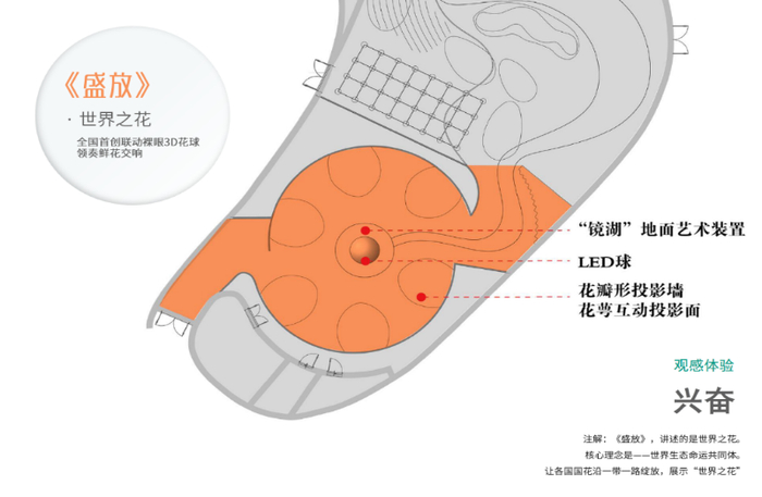 《盛放》展区融合声、光、影等数字技术,打造一个世界各国共享的百花园,观众可以启动一场鲜花交响烟火,获得神奇的互动体验。