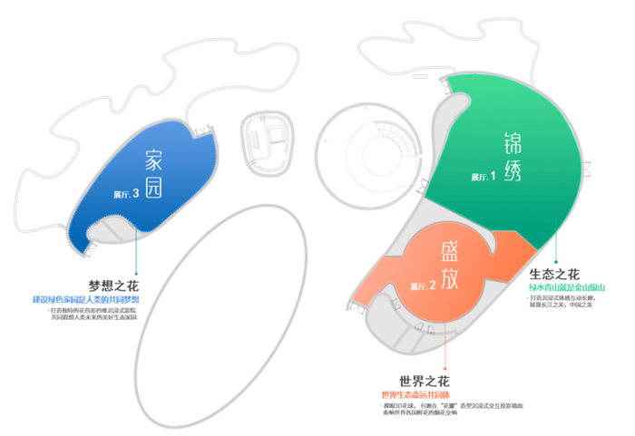 整个馆被分成2个展厅、3个展区,依次为《锦绣》《盛放》和《家园》。