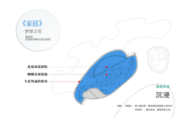《家园》展区为全球首创的花苞形主题影院,观众进入其中,瞬间被“花朵”包裹,畅游未来家园,沉浸式体验梦想之花的美妙境界。
