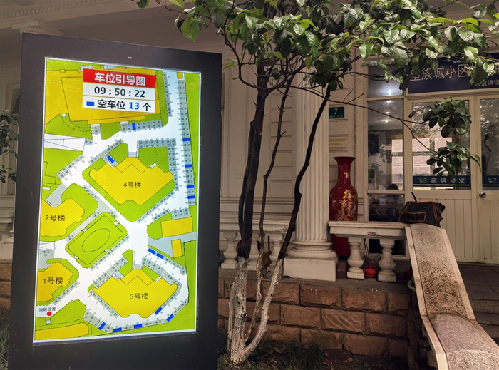 5月11日,记者又前往望族城小区体验数字化管理。在小区门口,自助操作的访客登记系统让人耳目一新,输入手机号领取验证码后,拍照留下人脸数据,随后24小时内可以刷脸进出小区;物业办公室门口,硕大的屏幕上展示的是一张“车位引导图”。每个车位下方安装的地磁感应系统反馈了小区目前存在的地面空余车位,并以深色标记在引导图上……