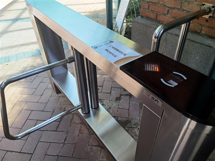 △图为东方剑桥御庭苑小区门口新安装的门禁闸机,启用后连入物业管理平台,可使用“绿城生活”APP刷开。