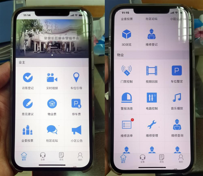 △图为上海望族城小区的物业APP界面。业主端提供了小区监控实时查看、车位引导、公共收益公开等功能。物业端提供了更多的管理功能。