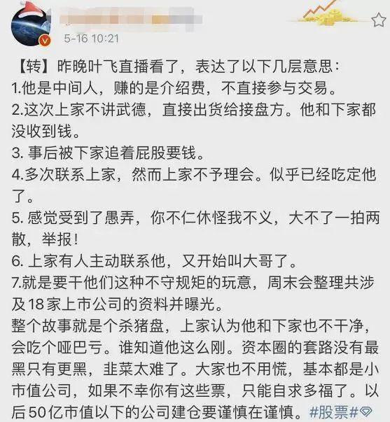 前私募冠军叶飞的爆料事件持续发酵,具体事件和细节请戳昨日的文章《私募大佬自曝A股超级黑幕!18家上市公司周末无眠,更大风暴下周见?》