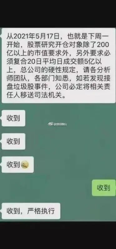 17日当晚,网传消息称,有机构下发通知称:“从2021年5月17日,也就是下周一,股票研究开仓对象除了200亿以上的市值要求外,另外要求必须复合20日平均日成交额5亿以上,总公司的硬性规定,请各分析师团队,各部门知悉,如若发现接盘垃圾股事件,公司必定将相关责任人移送司法机关。”