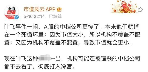 市值风云APP微博称,叶飞事件一闹,A股的中档公司更惨了。本来他们就掉在一个死循环里:因为市值太小,所以机构不覆盖不配置;又因为机构不覆盖不配置,导致市值就会更小。现在叶飞一出,机构可能连被错杀的中档公司都不去看了,彻底打入冷宫。