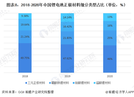2020年中国正极材料出货量51万吨,同比增长27%。从正极材料产品出货量结构来看,2018-2020年正极材料领域三元材料和钴酸锂材料占比略微下滑,2020年出货量占比分别为46%和16%,磷酸铁锂占比由21.24%上升到25%。