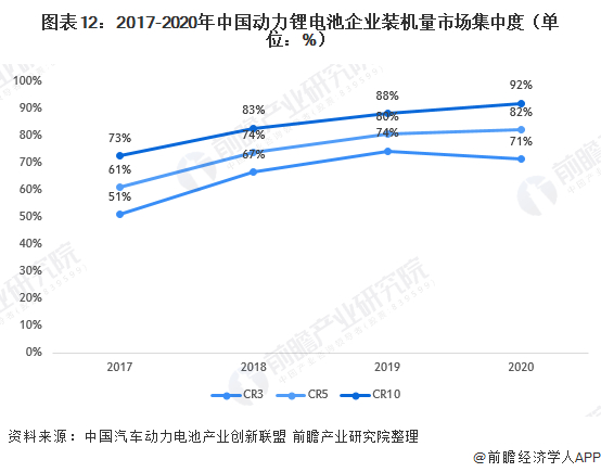 随着动力电池市场竞争进一步加剧,龙头企业优势不断放大,行业集中度持续提升。2020年,排名前3家、前5家、前10家动力电池企业动力电池装车量分别为45.4GWh、52.3GWh和58.4GWh,占总装车量比重分别为71%、82%和92%。