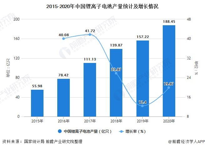 近年来3C产品对锂电池需求量的稳定增加,以及随着新能源汽车的市场规模逐步扩大和储能电池的需求扩大,我国锂电池产量规模逐年扩大。根据国家统计局数据显示,2015-2019年我国锂电池的产量不断增长。2019年,我国锂离子电池产量为157.22亿只。截止至2020年,我国锂离子电池产量达188.45亿只,同比增长19.87%。