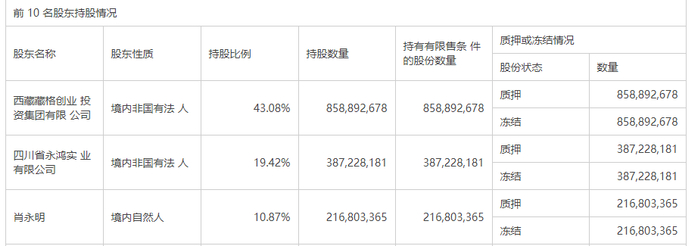 公司一季报显示,藏格控股控股股东藏格集团及其一致行动人永鸿实业、肖永明、林吉芳累计被冻结股份数量为14.67亿股,占其所持公司股份数量比例达到100%。