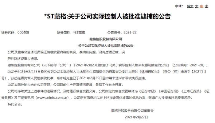 2月27日,藏格控股再度公告称,公司于2021年2月25日晚间收到公司实际控制人肖永明家属提供的青海省公安厅出具的《逮捕通知书》(青公(经)捕通字【2021】3号),获悉经青海省人民检察院批准,肖永明已于2021年2月25日因涉嫌非法采矿罪被执行逮捕。