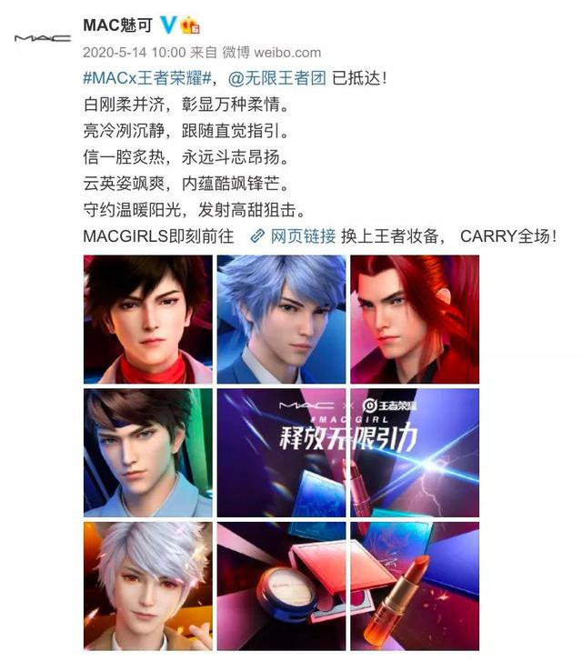 化妆,自然也不再是女性的“专利”。更多男性艺人选择口红、眼线、眉笔凸显自己的五官,飞扬的眼线、浓重的烟熏妆曾经给黄子韬带来争议和嘲笑,如今却成为他鲜明的个人风格;大量化妆品牌选择男性艺人代言口红、粉底,美妆品牌Mac甚至联合游戏《王者荣耀》推出了男团限定色口红。