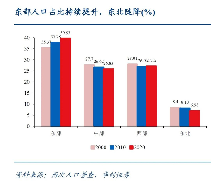 孔雀东南飞。以广东、江苏、浙江为代表的东部省份,未来仍旧是中国人口吸引力最强的区域,借助城市群和都市圈战略,东部地区的人口比重有望继续抬升。