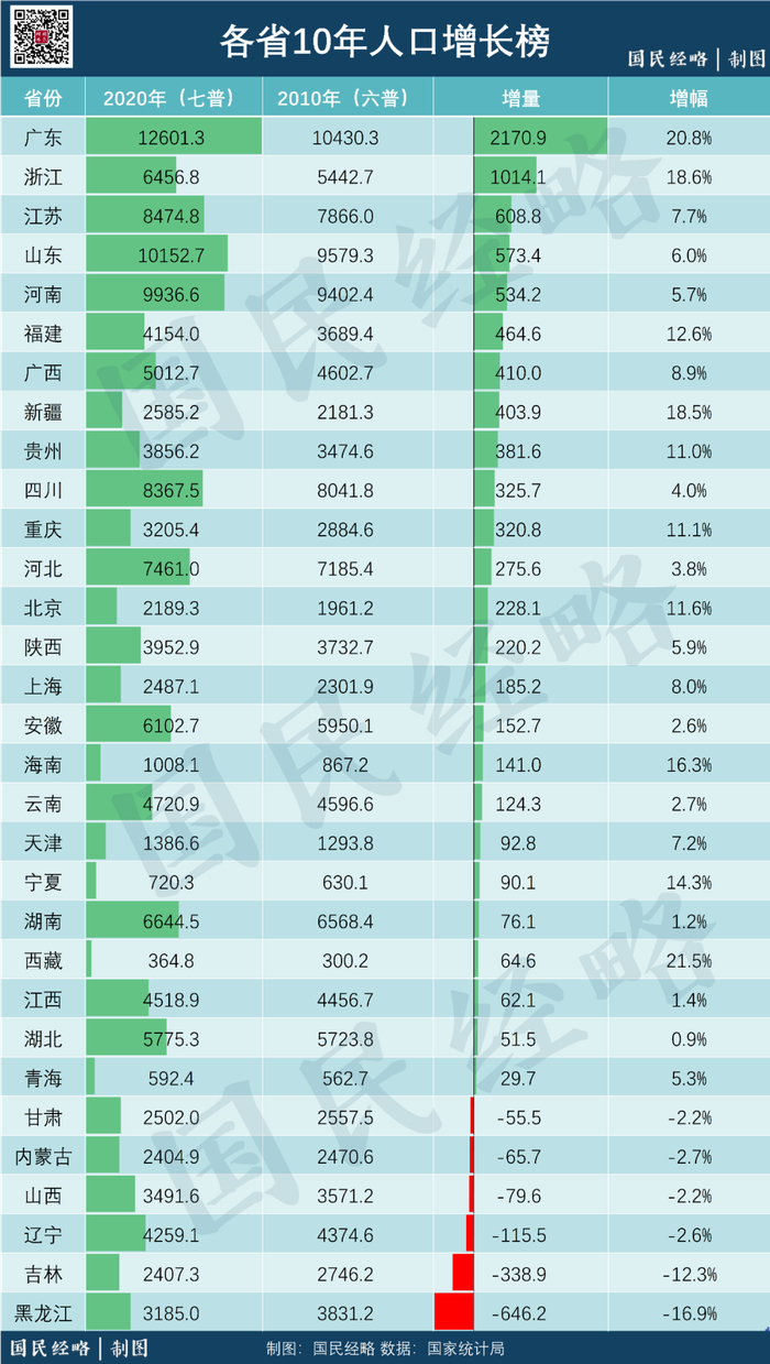 过去10年,全国新增人口超过7000万人,但不是每个省份都能享受这一红利。