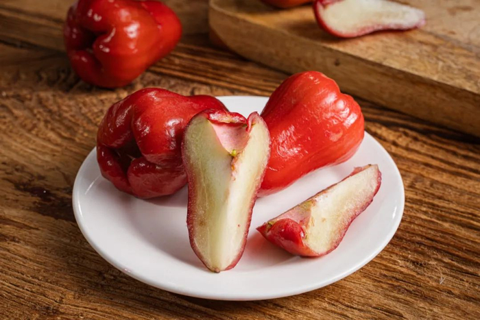 好吃的莲雾不辜负“长在树上的矿泉水”这个称号,外表是喜人的深红色,通体脆嫩,从底部整个咬,一口下去全是汁水,清脆甘甜。因为它含有许多水分,故具有宁心安神、清热、利尿的作用,也是解热之良果。