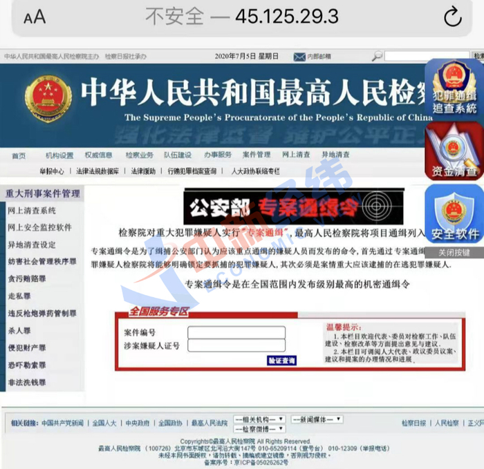 之后,这人对我进行了一系列威胁恐吓,称我涉及到一起国家二级金融洗钱案,并发给我一个所谓“中国最高检”的网站,让我输入他告诉我的案件编码,输完后我看见一份统计表,上面有我的姓名、身份证、照片等详细信息。