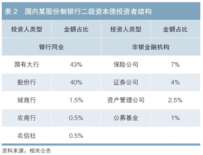 笔者统计了2019年以来某股份制银行二级资本债的投资者类型及结构(见表2)。根据实践经验,这一案例与国内资本性债券投资者的整体结构大体一致。从资本性债券的投资者类型看,可分为银行同业和非银金融机构两大类。前者包括各类商业银行和农信社,是投资主力,投资占比通常达70%~85%。后者包括保险公司、证券公司、资产管理公司及公募基金等,投资占比较低。在商业银行同业中,资金来源又可分为银行自营资金和理财资金。从整体来看,国内资本性工具投资者类型较集中。