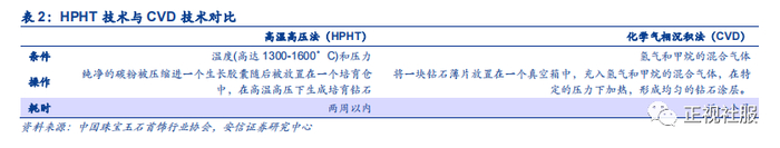 天然钻石形成的条件为在1100°~1500°的高温、4.5~6Gpa的高压下,通过地壳运动的挤压而形成的金刚石原石,因此人造钻石需要通过人为形成与天然钻石形成相似的温度和压强,通过一系列技术将其转化为钻石,通常使用较多的方法为高温高压法(HPHT)和CVD法。