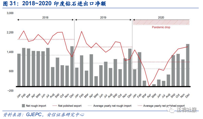 受疫情反复影响,印度出口净额或再次下降: 2020年上半年印度加工钻石出口净额在疫情影响下迅速减少,但随着疫情影响逐渐消退,下半年出口额迅速恢复,总体较2019年同比下降31%,至141.7亿美元,2021年3月印度加工钻石出口净额已达18.3亿美元,同比上升152%,1-3月出口净额达49.6亿美元,同比上升48%,基本已实现恢复,但由于4月起印度疫情反复,未来出口净额将有大幅下滑,导致整体加工成本上升。