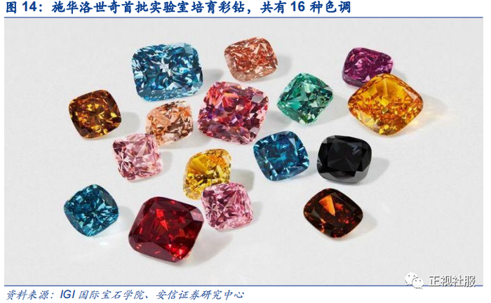 优势三:培育钻石在尺寸、颜色等方面具有较好的可控性,能够实现款式量身定做,满足消费者的个性化需求。在进行钻石实验室培育时,可以通过加入不同化学元素或特定工艺实现 不同色调。如 HPHT 培育出的黄色或橙黄色钻石的颜色是由于在生长过程中引入了孤立的氮, 随着孤氮含量的增加,钻石出现黄色会越来越鲜艳;蓝色 HPHT 培育钻石是由于培育仓内加 入的硼而产生的;粉色系的 HPHT 培育钻石以及 CVD 培育钻石基本都归因于钻石在生长结束后通过辐照和低温退火进行了处理,等等。2020 年 1 月,施华洛世奇公布了首批实验室 培育彩钻,包含 16 种色调,而特殊色调的天然钻石价格则十分昂贵。