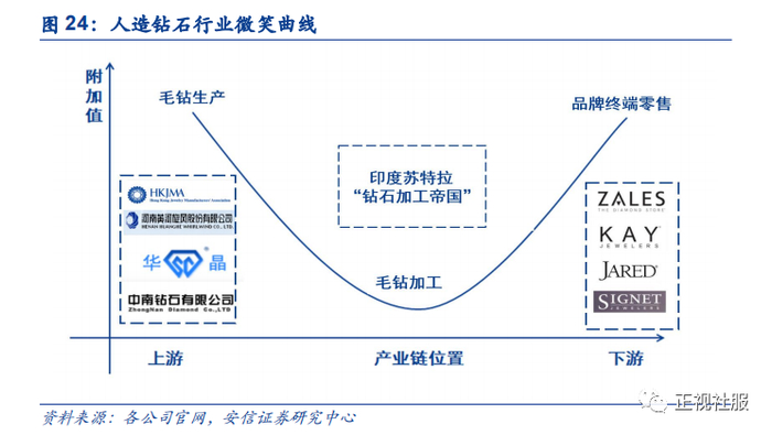 上游毛利率超50%,产业链按利润率形成微笑曲线。从利润分布来看,人造钻石行业上游毛钻生产以及下游终端零售毛利率较高,而中游钻石加工毛利较低,根据力量钻石招股说明书,2018~2020年其培育钻石毛利率分别为48.49%、61.21%、66.88%,下游钻石零售行业2018~2020年平均毛利率分别为49.94%、63.3%、67.05%,而中游加工生产毛利率约为10%左右,根据行业利润率形成了微笑曲线。