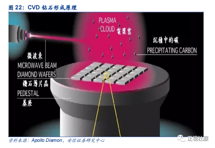 3) 沉积:气体在成为等离子体的过程中碳原子会向钻石晶种靠近,逐渐在其表面上沉积出一层钻石薄膜。