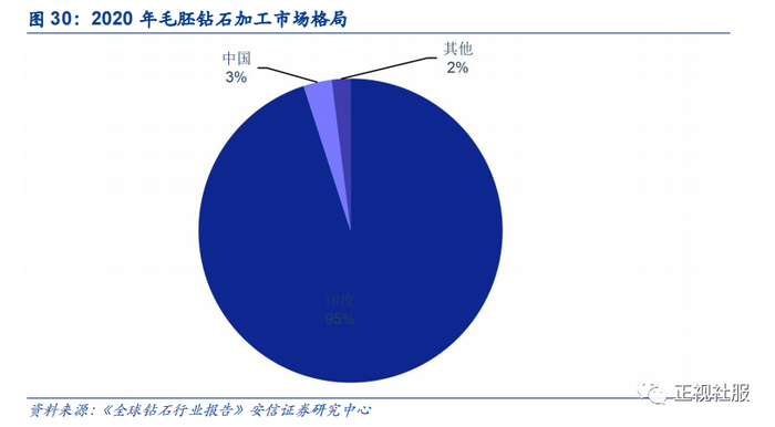产业呈劳动密集型,印度占据主要加工市场。由于钻石加工需要根据不同的成品需求加工出不同的形状,因此加工行业较难实现自动化生产,需要经验人员进行切磨操作,因此人力成本较高,属于劳动密集型行业。由于印度人力成本较低,且进入钻石加工行业较早,因此占据了加工市场较大份额,根据贝恩咨询发布的《2020~2021全球钻石行业报告》,2020年印度在疫情影响下降低了23%的毛胚钻石净进口量,但仍占据了95%的毛胚钻石加工市场,同时,中国由于复工时间较早,受疫情影响较小但只占据了3%的市场份额。