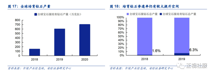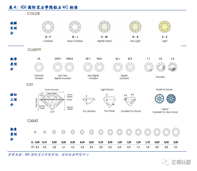 众多权威机构明确培育钻石的概念,为行业的规范发展提供健康引导。1)国内方面,2019年国家珠宝玉石质量监督检验中心(NGTC)就发布了Q/NGTC-J-SZ-0001—2019 《合成钻石鉴定与分级》的企业标准。2020年12月30日,发布了2020年版企业标准代替了在2019年版,并于2021年2月1日正式实施。最新标准中明确中文名称为“合成钻石”或“实验室培育钻石”,和对应的英文名称为“synthetic diamond”和“laboratory-grown diamond”。 以及取消分级,改为品质评价。2020年版企标的合成钻石品质评价与自然界的稀有度无相关性,虽然参照了GB/T 16554《钻石分级》执行,但不再使用“分级”的措辞,而是强调其作为“产品”的属性(品质评价),以便于和天然钻石进行明确的区分。2)国际方面:实验室培育钻石也得到了国际标准化组织和众多重要机构的关注。2015年,国际标准化组织(ISO)颁布了《珠宝首饰-钻石业消费信心》标准,明确合成钻石(synthetic diamond)与实验室培育钻石(laboratory-grown diamond)为同义名称;2018年,美国联邦贸易委员会(FTC)修订了钻石的定义,去掉了天然的限定;2019年3月底,国际宝石学院(IGI)发布公告,称其最新发布的新版证书中,将使用术语“实验室培育钻石”替代“合成钻石”;2020年8月,美国宝石学院(GIA)推出数字化全新实验室培育钻石分级报告;2020年10月,CIBJO颁布了《实验室培育钻石指引》,既保障了消费者对钻石行业的信心,也指出实验室培育钻石不适用于分级,检测证书应与天然钻石有所区别。