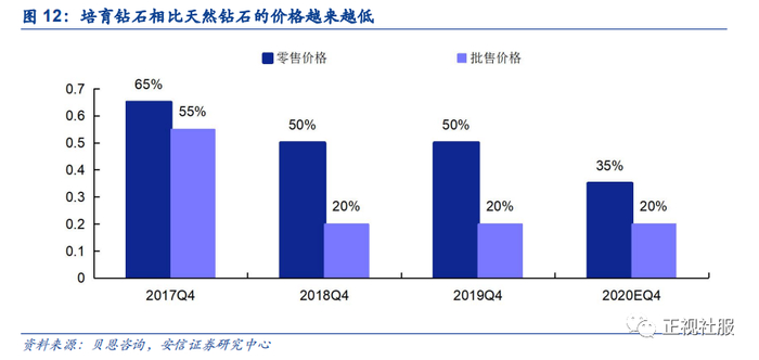 优势一:培育钻石较天然钻石更具性价比,且随着技术进步价格逐年降低。培育钻石的价格 较天然钻石明显较低,且随着技术进步呈现逐年降低的趋势。2017Q4,培育钻石零售/批发 价格分别是天然钻石的 65%/55%,到了 2020Q4 进一步降低至天然钻石的 35%/20%,具有 更高性价比。
